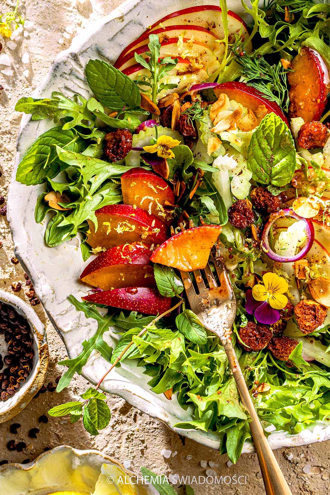 ŚRÓDZIEMNOMORSKA SAŁATKA Z FALAFLAMI CIECIORKOWO-CUKINIOWYMI, PAPRYCZKAMI PADRON, MARCHEWKĄ BALSAMICZNĄ, TZATZIKAMI I DRESSINGIEM SEZAMOWYM