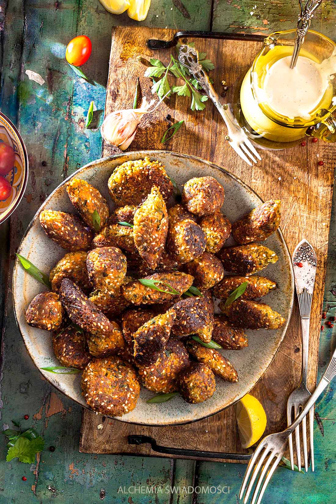 JAGLANE PULPETY BARBECUE Z BROKUŁEM, PIECZONYM BATATEM, DRESSINGIEM TAHINI
